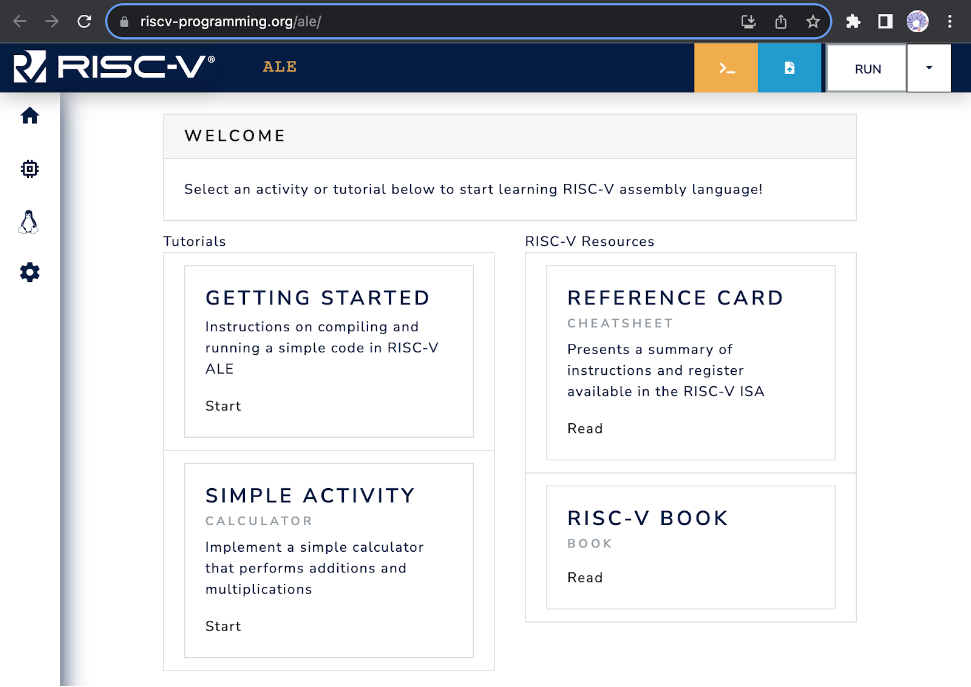The RISC-V ALE simulator will run in your web browser (e.g., Chrome or Firefox). To do this, simply visit the page https://riscv-programming.org/ale/. Figure 3.0.1 illustrates the initial interface of the simulator.